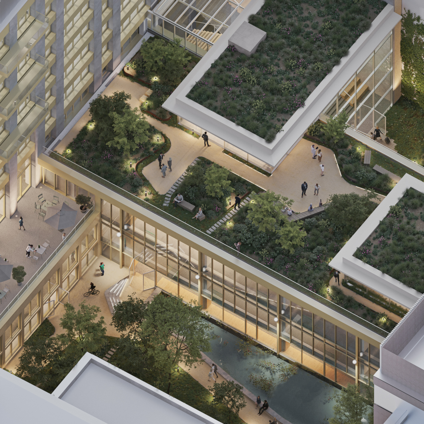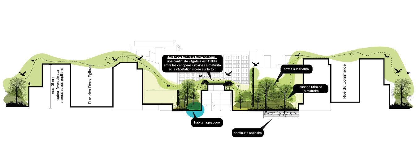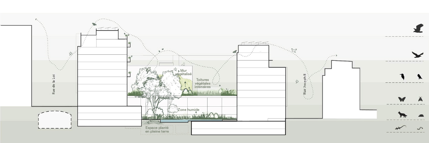 Various habitats have been defined, corresponding to multiple typologies of green, such as intensive green roofs, vertical green, and a forest-like environment on full soil. The diversity of green atmospheres on multiple levels will strongly support the local biodiversity, while providing the users of the building with a pleasant working and living environment.