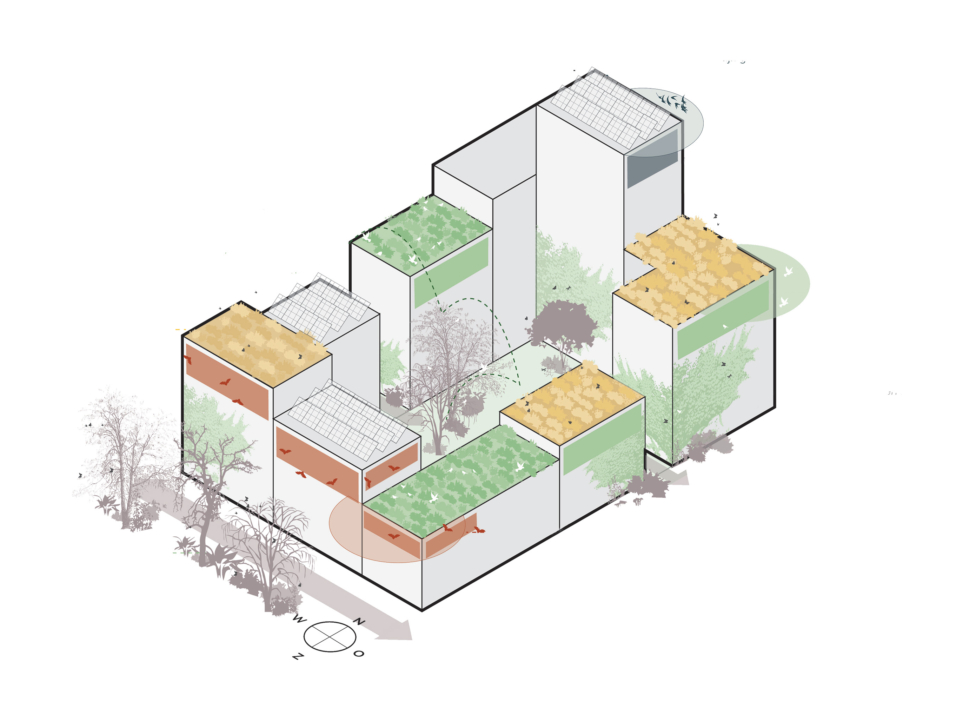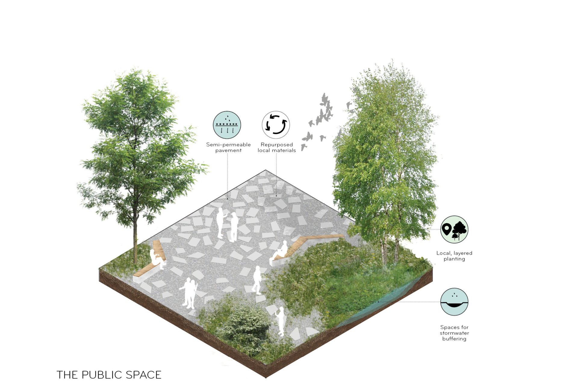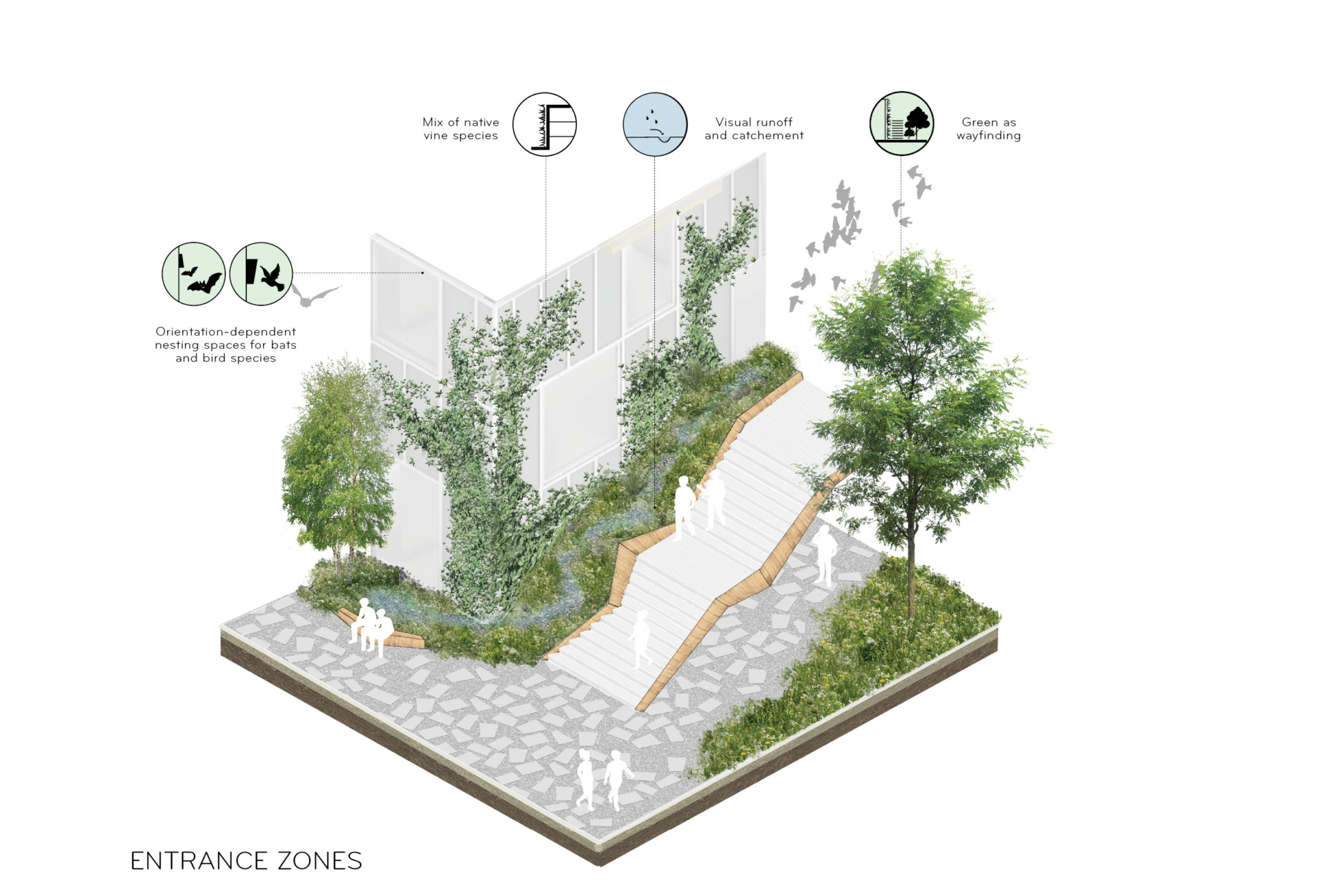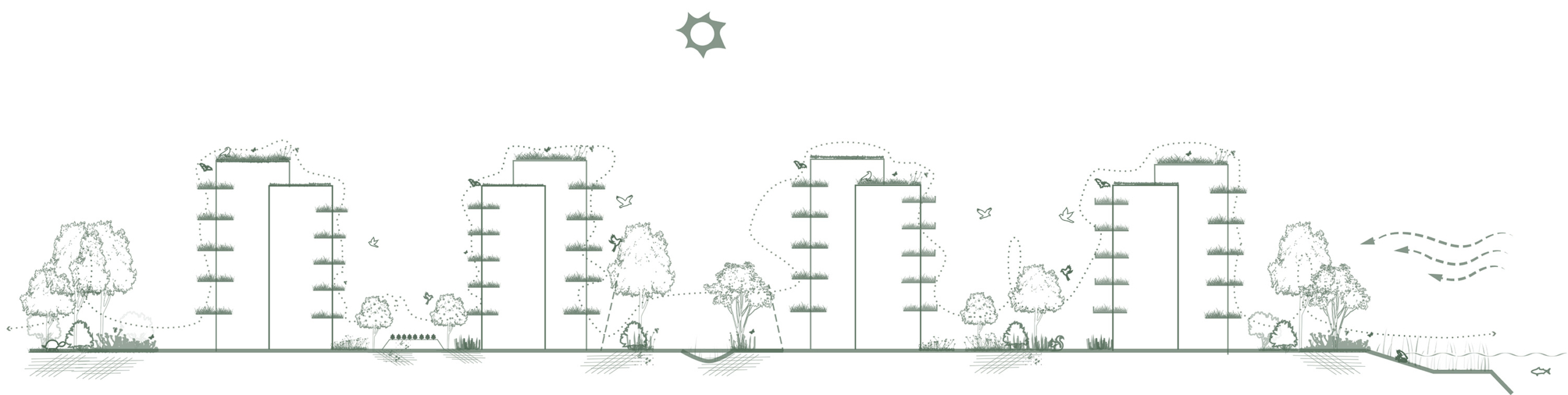 Our approach to shaping public space considers both the spatial needs of the new inhabitants and the requirements of the local wildlife, ensuring safe passages and shelter options for the animals in the area.