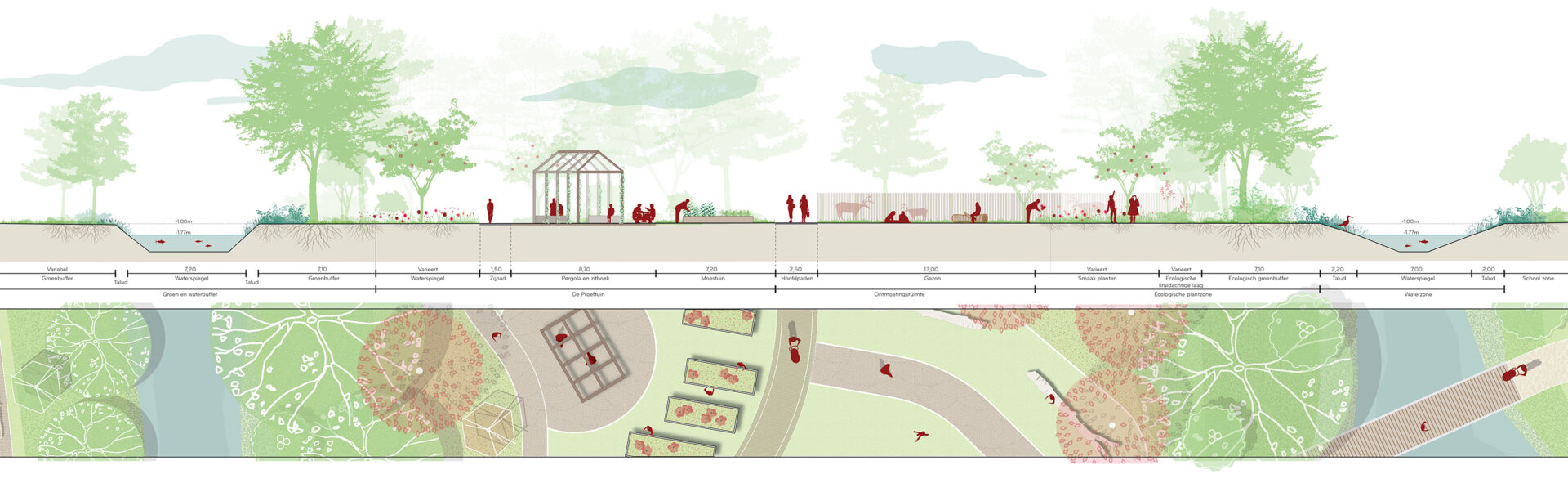 Verschillende beplantingstypen – bestaande en nieuwe bomen, gelaagde beplantingen, onderbeplanting en waterbeplantingen – bieden voedsel, onderdak en connectiviteit voor de omliggende omgeving, waardoor een sterk ecologisch kader rondom het park ontstaat. We streven ernaar om ecologisch-recreatieve verbindingen tussen de parken en hun omgeving te versterken, zodat de inwoners van Hillegom kunnen vertragen en opnieuw verbinding kunnen maken met de natuur. De beplantingskeuzes binnen dat kader zijn afgestemd op hun respectieve zintuiglijke thema’s. Elke tuin heeft zijn eigen karakter, met naadloze overgangen tussen de thema’s.