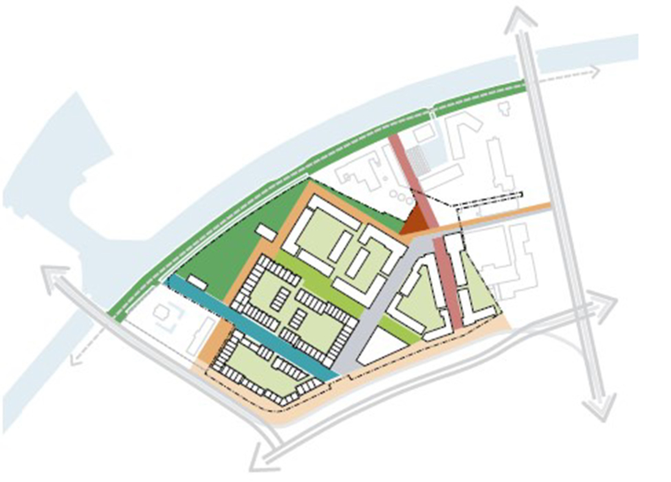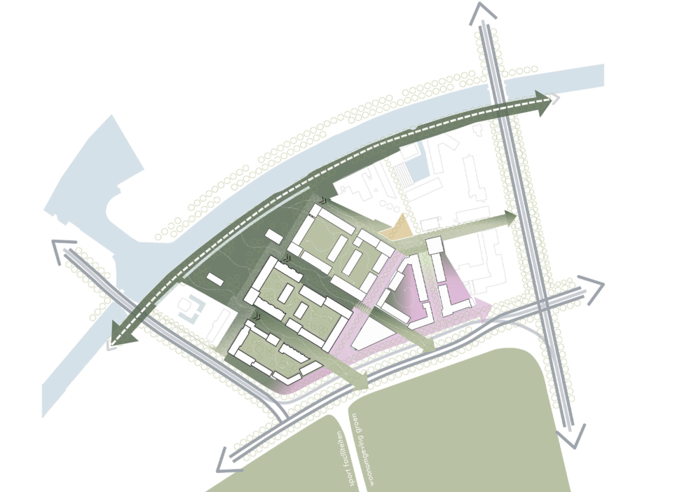 Ons voorstel voor het ontwerp van de openbare ruimte is gebaseerd op het principe van ‘Healthy living’. Hierbij wordt aandacht gegeven aan alle specifieke factoren die bijdragen aan de algehele gezondheid, zoals luchtkwaliteit, geluidsreductie, veiligheid en een actieve levensstijl. Als integraal onderdeel van het concept ‘Healthy Urban Living’ geeft de openbare ruimte prioriteit aan voetgangers en fietsers en biedt het een gevarieerd aanbod aan activiteiten die geschikt zijn voor alle leeftijdsgroepen, waaronder sport, spel en vrije tijd. De openbare ruimte krijgt een brede variëteit aan typologieën, waarmee de onderscheidende kenmerken van het gebied worden benadrukt. Zo creëren we een gevarieerde mix van plekken om te verblijven, te spelen of veilig doorheen te bewegen. Een doorlopende openbare promenade dient als verbindende schakel tussen de nieuwe wijk en het stadspark aan het Merwedekanaal.