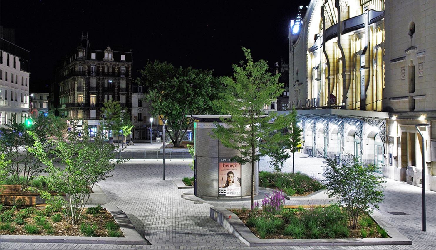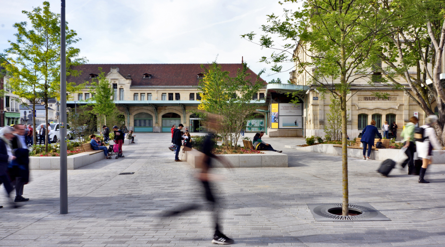 Through extensive traffic reorganisation, the decluttering and extension of the forecourt towards the town centre and the continuity of materials, the opportunity for the passenger building to open up onto its square and the forecourt onto the centre of Rouen has been created. The opposite Jeanne d’Arc street has been designed as a natural extension of the square in the form of a promenade, offering continuous and comfortable pedestrian routes to the town centre and the different transport modes: trains, buses and metro.