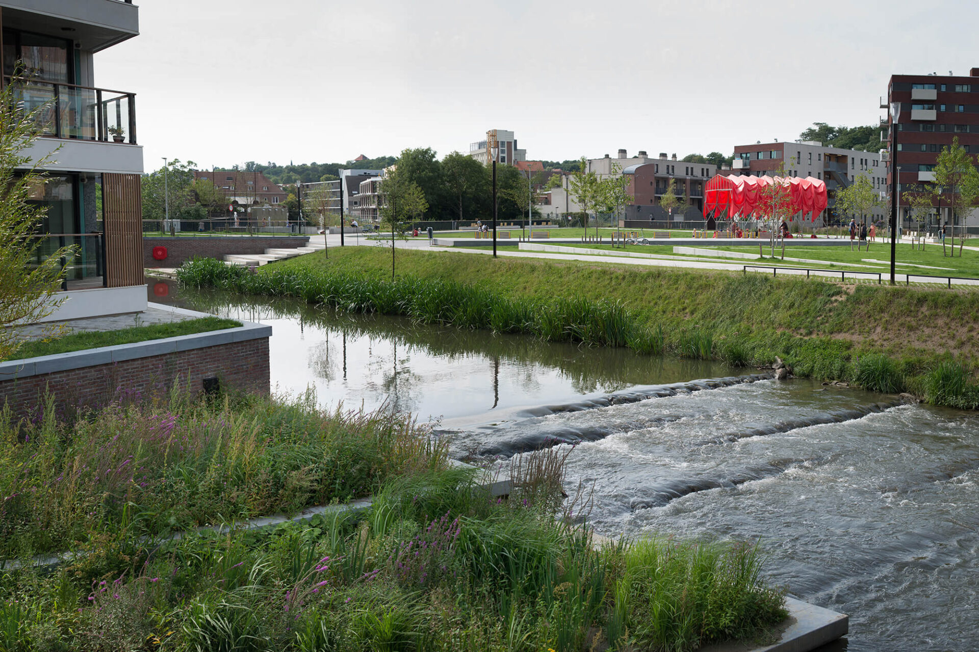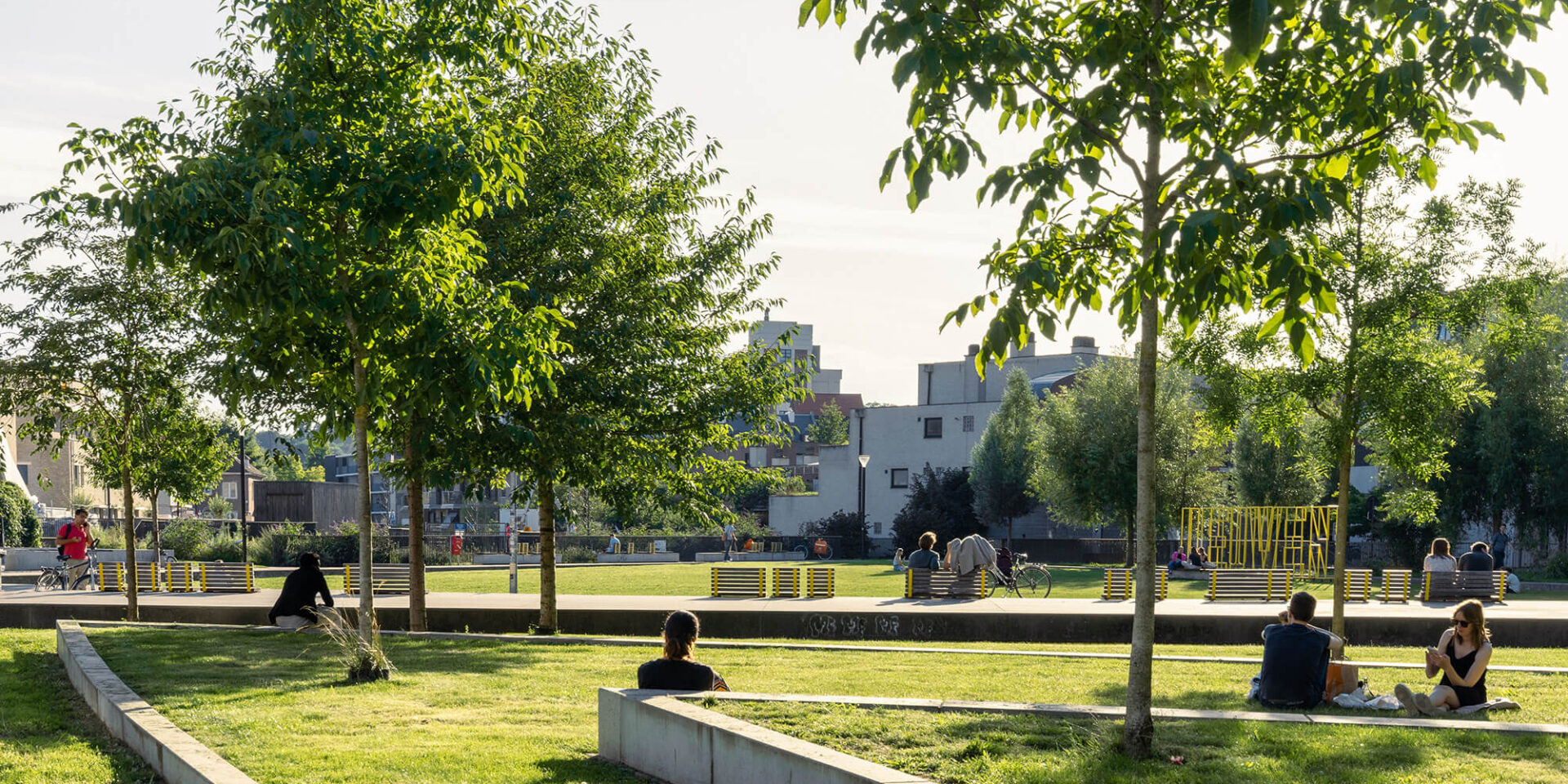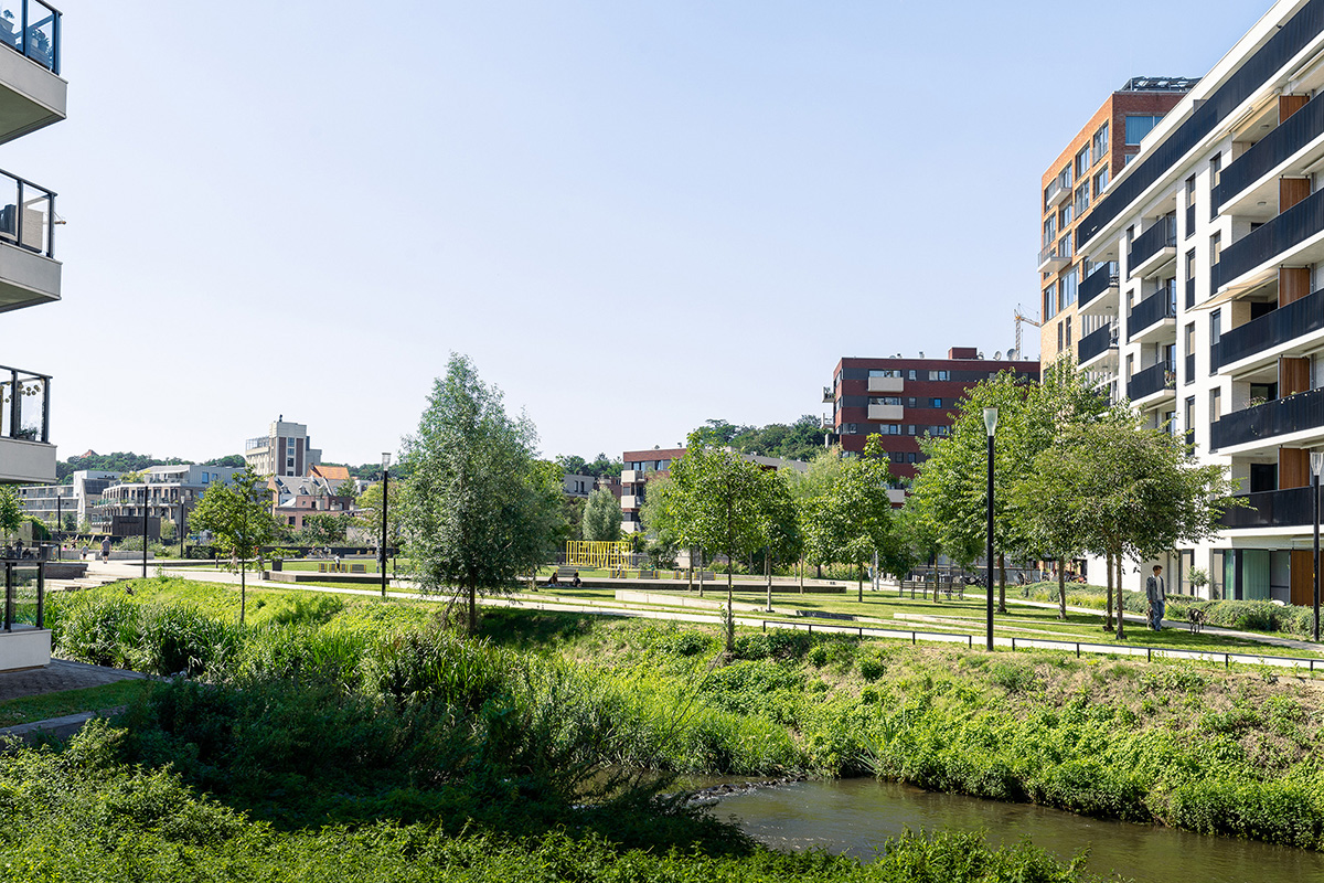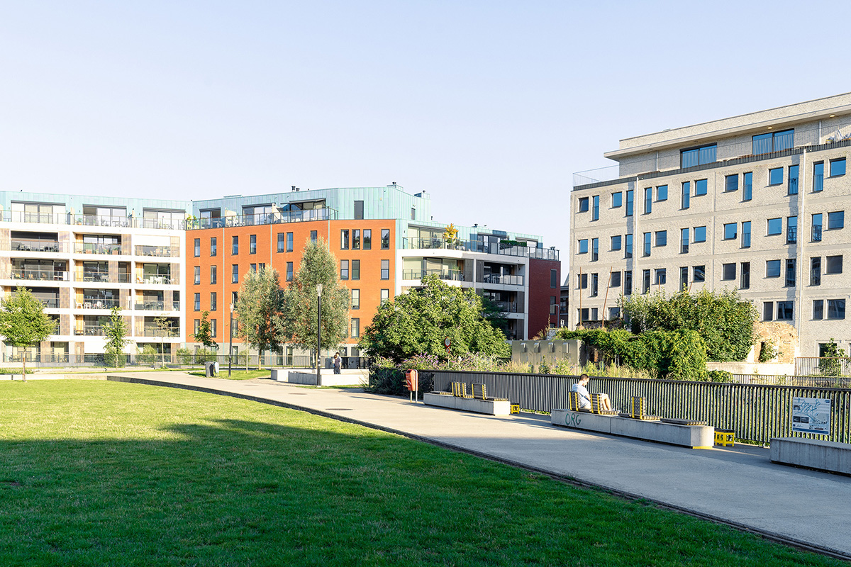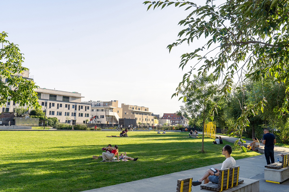 The redevelopment of the area around Vaartkom in Leuven has transformed a former industrial site into a thriving mixed-use district, seamlessly integrating housing, offices and commercial spaces. Remarkable buildings of great historical value have been repurposed, while some outdated structures have given way for new developments. Sluis park plays a crucial role in this transformation, turning a once-neglected space into a dynamic urban park that fosters community life.