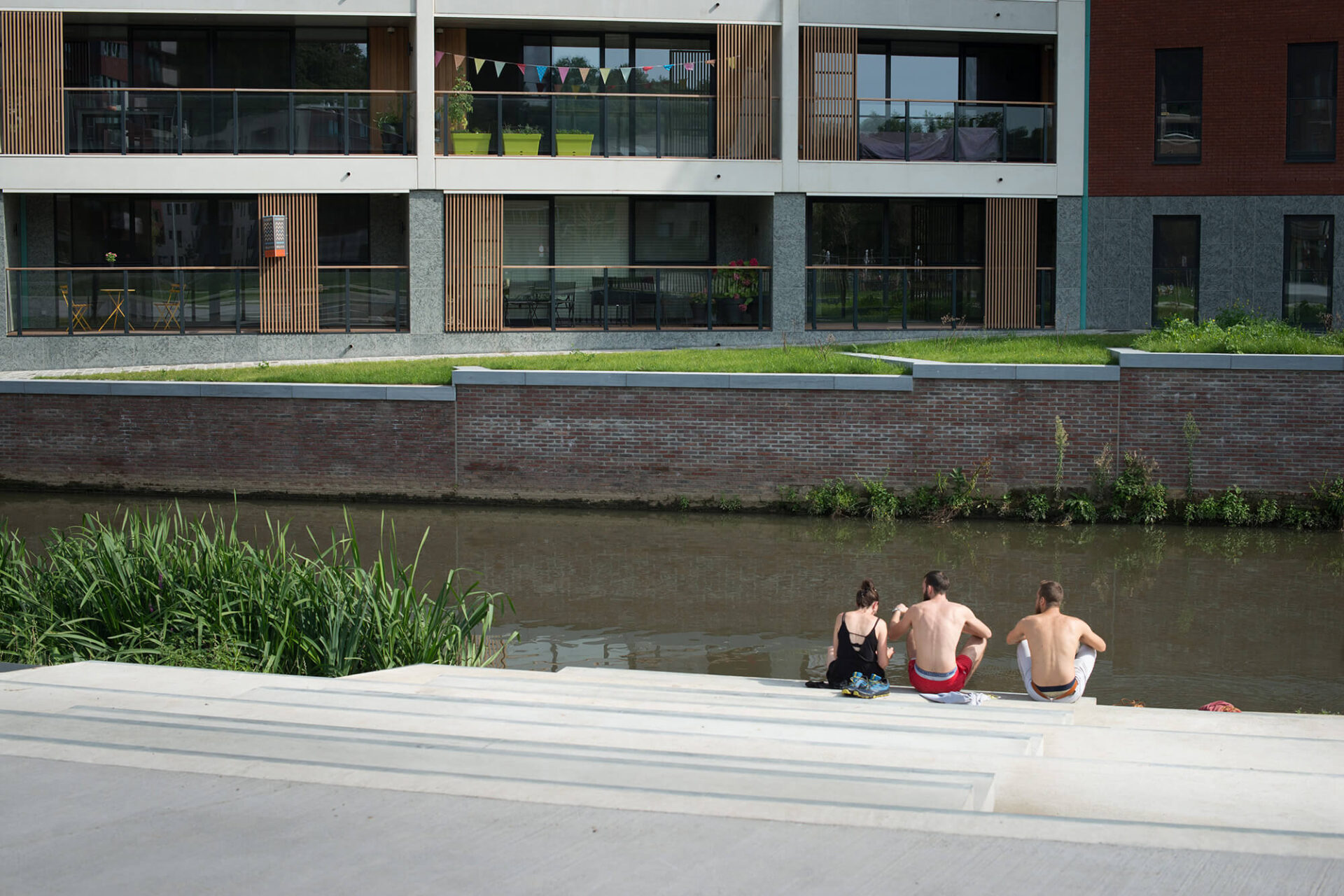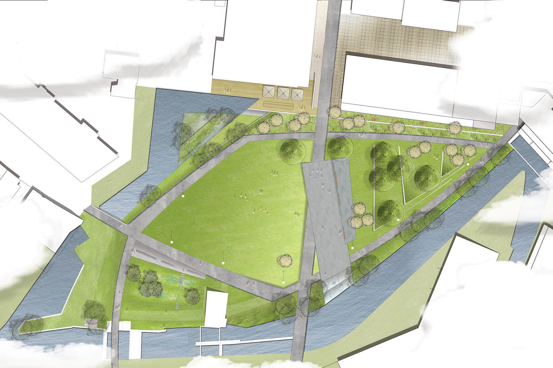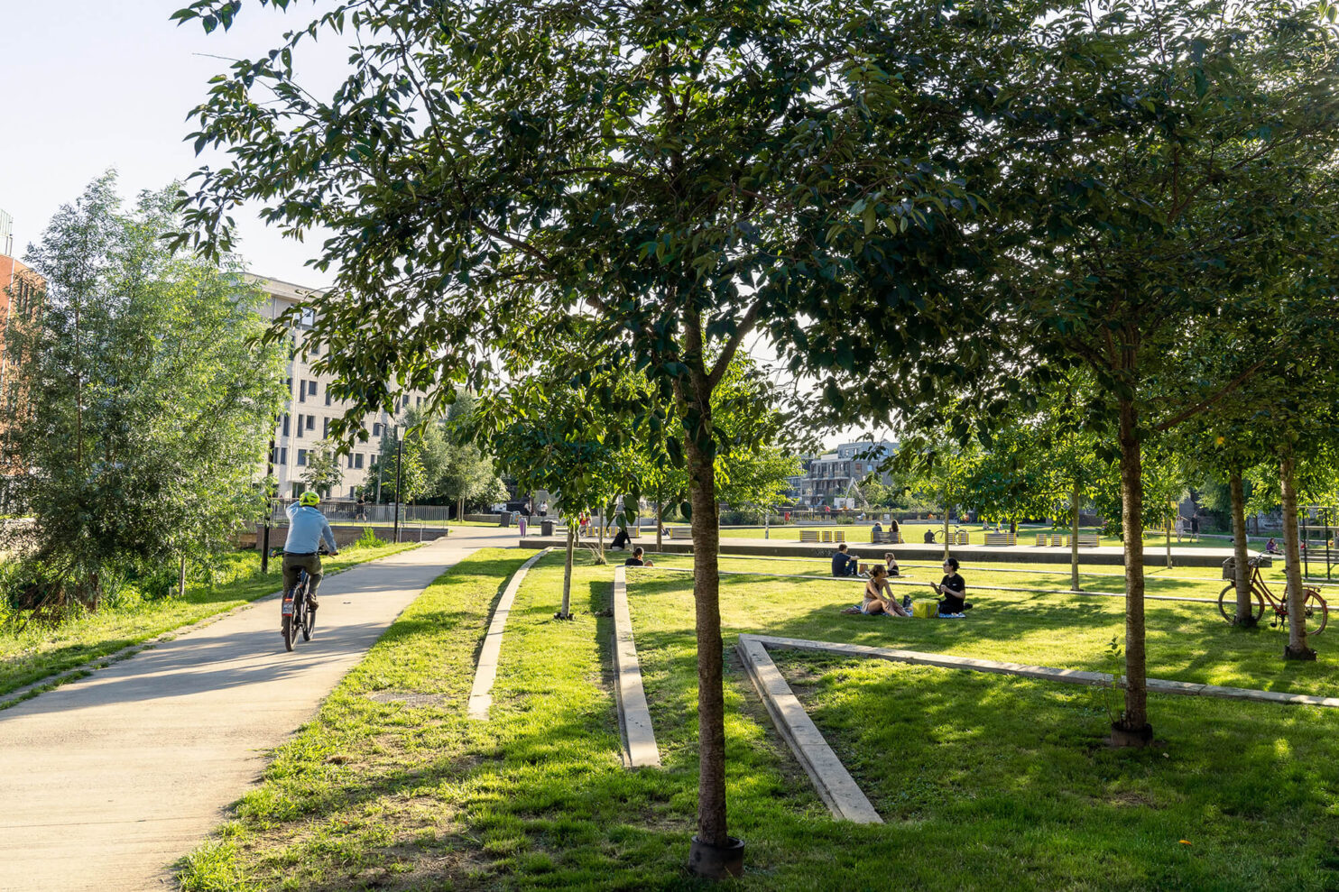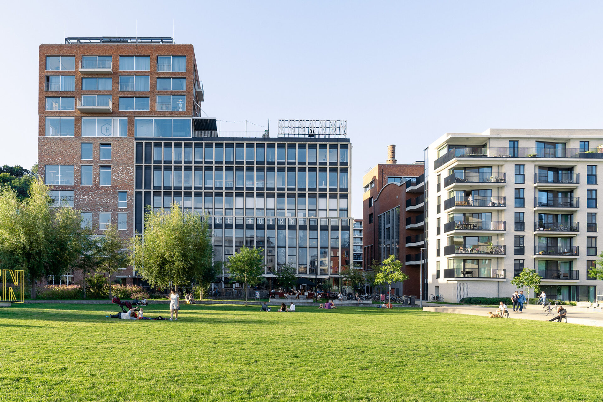 The redevelopment of the area around Vaartkom in Leuven has transformed a former industrial site into a thriving mixed-use district, seamlessly integrating housing, offices and commercial spaces. Remarkable buildings of great historical value have been repurposed, while some outdated structures have given way for new developments. Sluis park plays a crucial role in this transformation, turning a once-neglected space into a dynamic urban park that fosters community life.